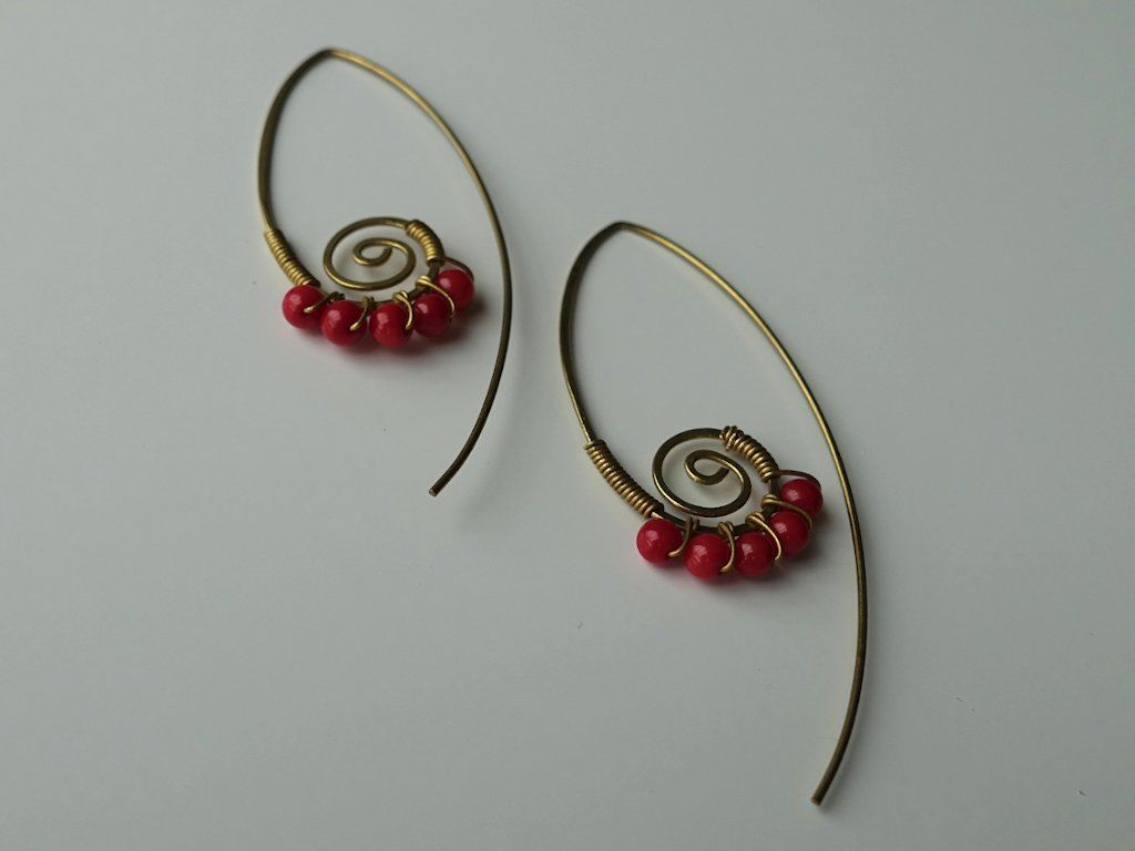 Drobné červené korály ve tvaru spirály zdobí hlavní část náušnice. Mosazné provedení přidává na eleganci. Stačí náušnice provléknout a vyrazit na romantickou večeři, do práce nebo na párty.