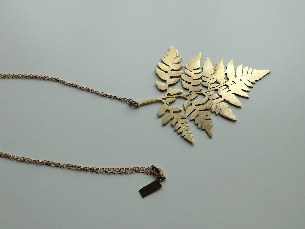 Působivý náhrdelník z mosazi Wild Fern se skládá z jemného mosazného řetízku a přívěšku ve tvaru kapradiny. Každý detail přísvěšku v sobě nese pečlivou ruční práci. Jednotlivé větvičky kapradiny jsou vyhnuté do stran, náhrdelník tak získává 3D rozměry.